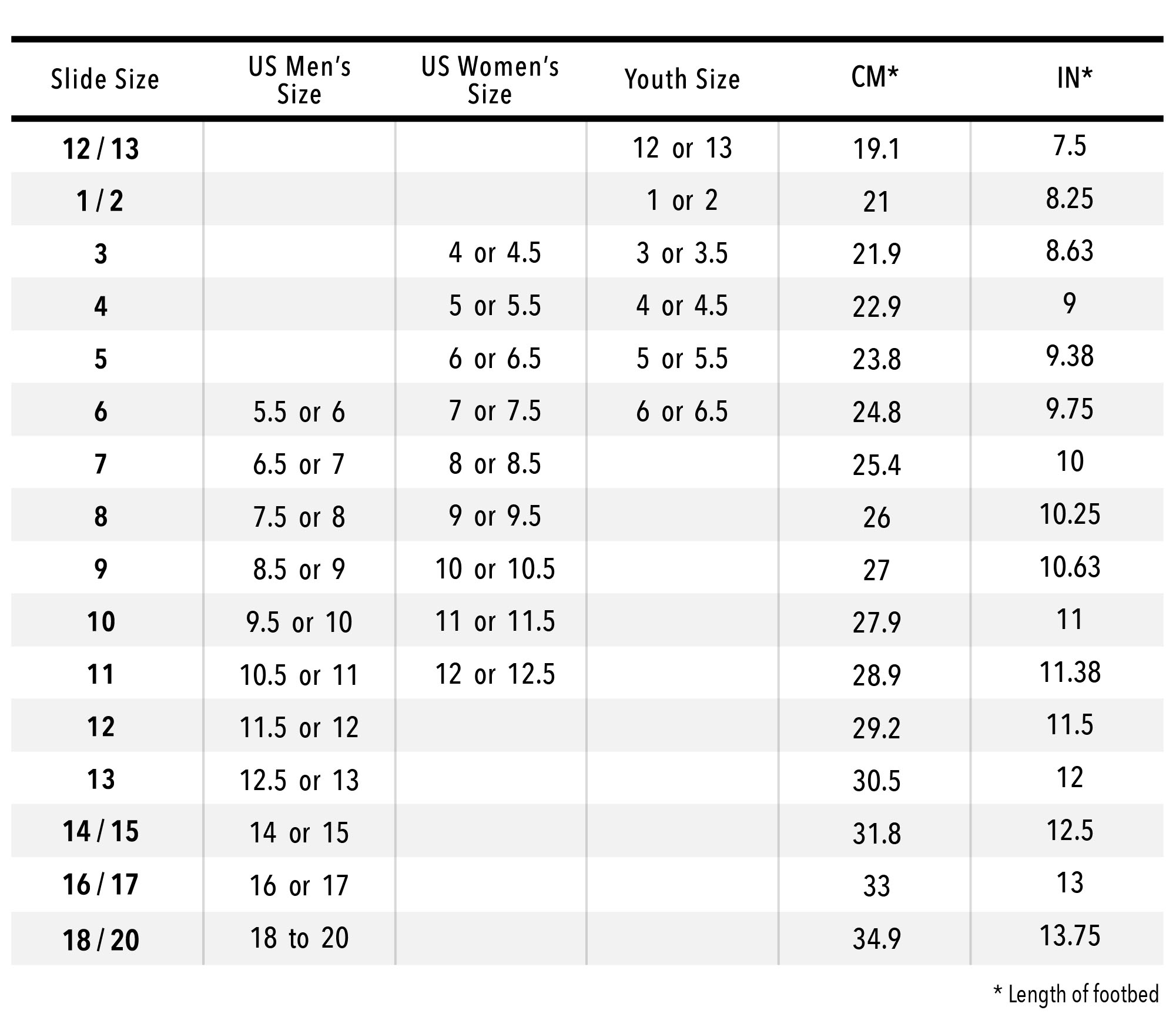 • Slide size is unique and based on men's mold. Please check sizing chart for size measurements.